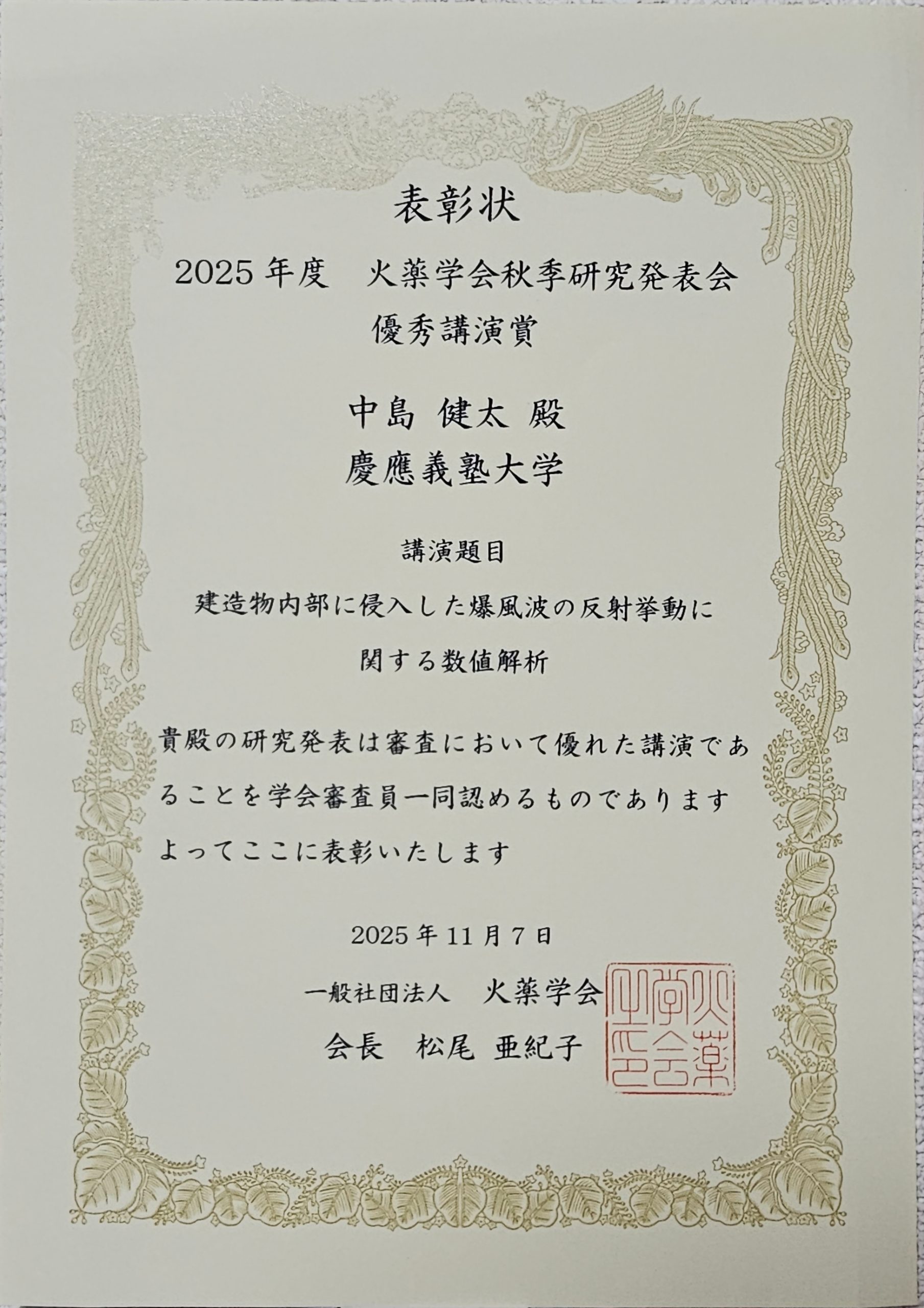 2026年1月31日中島 健太(松尾研究室 修士1年)2025年度火薬学会秋季研究発表会優秀講演賞