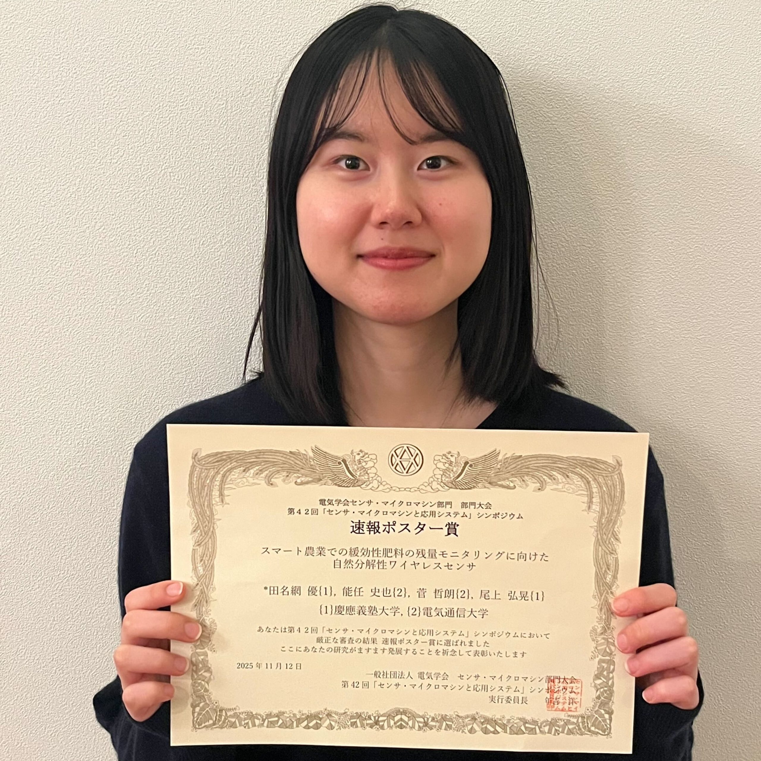 2026年1月31日田名網 優(尾上研究室 修士2年)第42回「センサ・マイクロマシンと応用システム」シンポジウム 速報ポスター賞